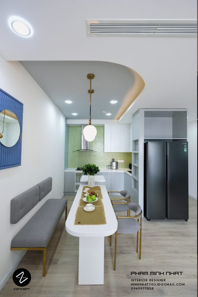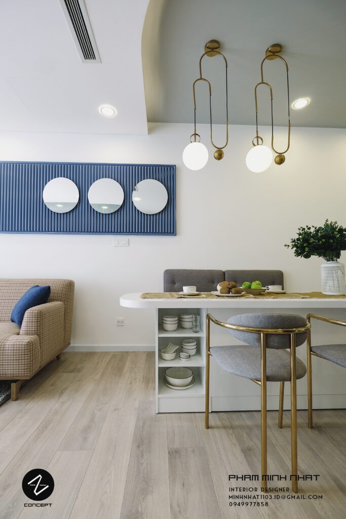Đường cong còn được thể hiện ở nhiều góc và chi tiết nội thất của căn hộ. Từ trần thạch cao, tay nắm cửa, đèn trang trí… tạo nên sự đồng nhất cho ý tưởng thiết kế.