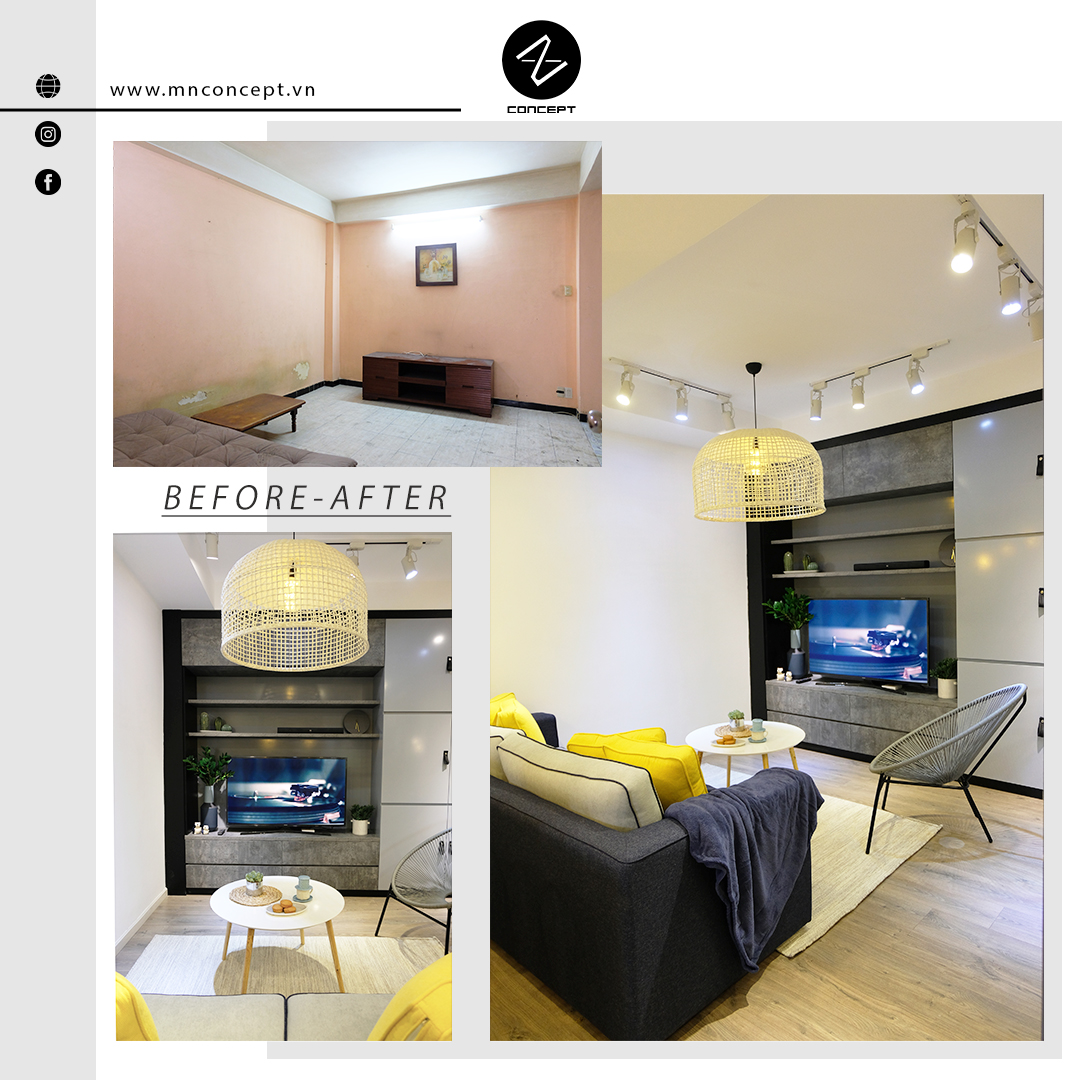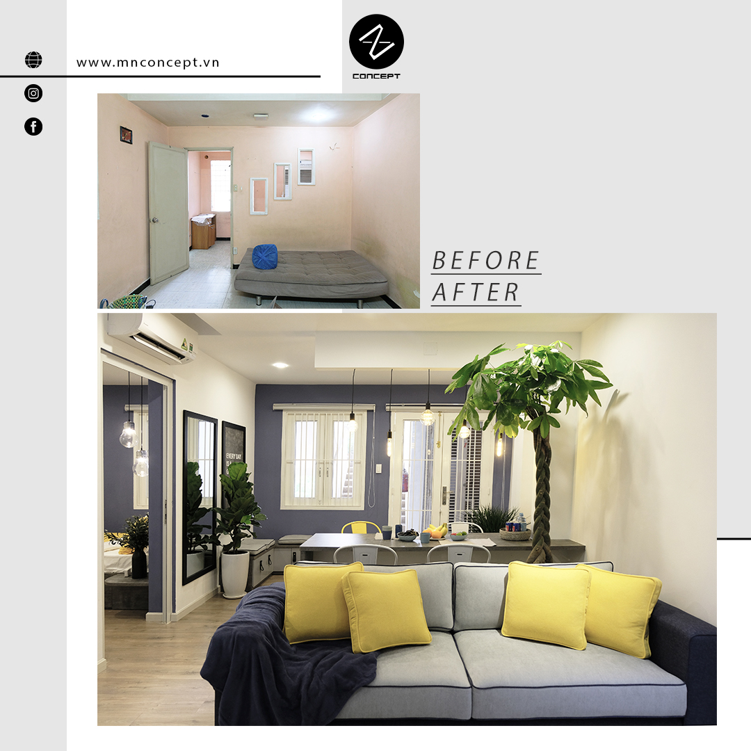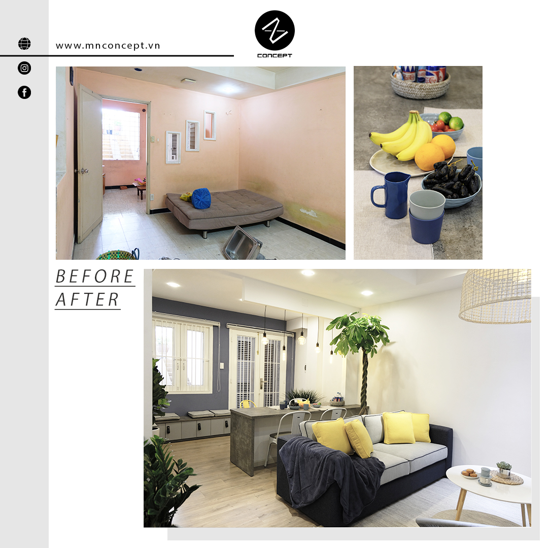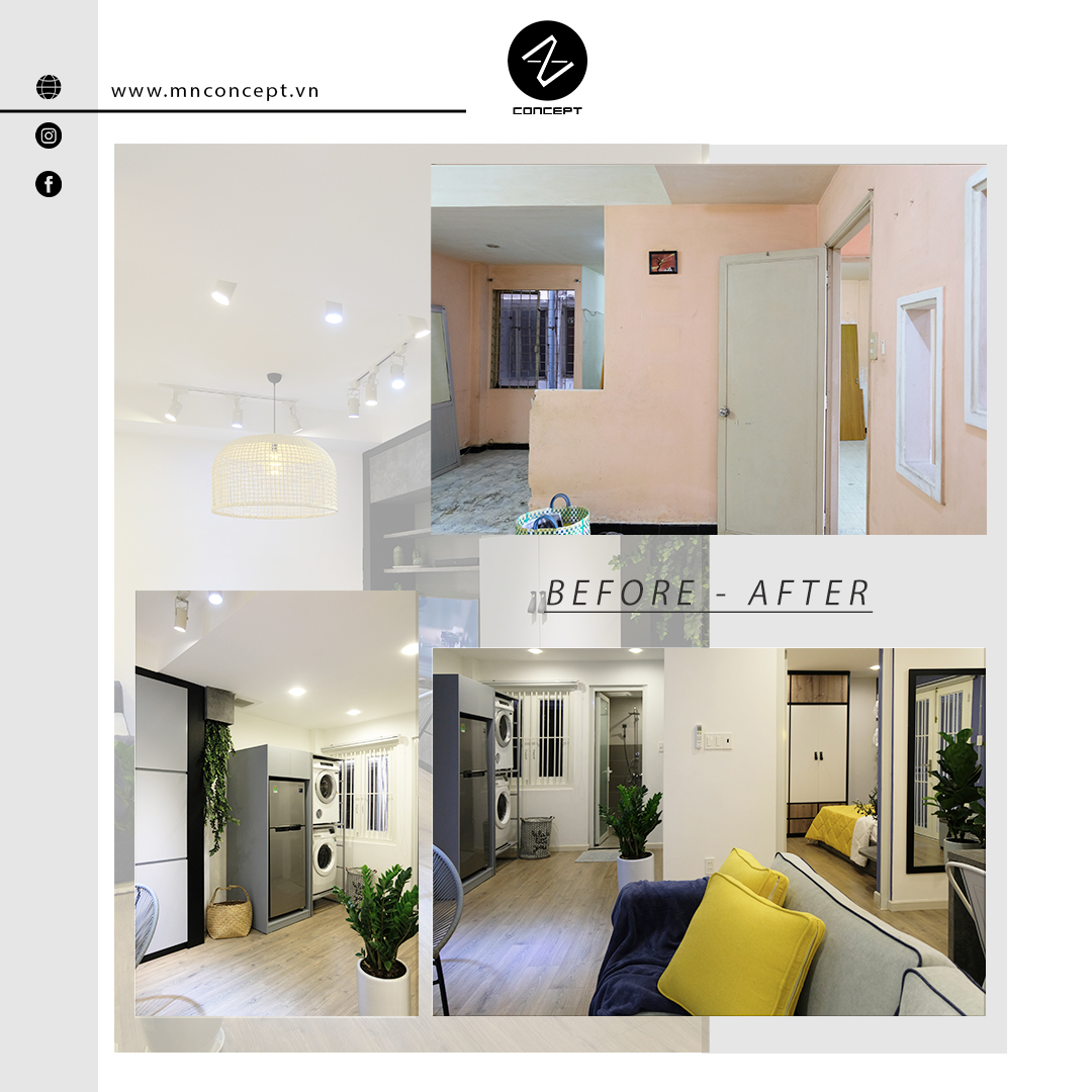 • Căn hộ có diện tích 45m2 nằm trong khu chung cư Nguyễn Kiệm của Sài Gòn. Sau một thời gian sử dụng căn hộ đã xuống cấp, các vách tường ngăn không gian và cách bố trí phòng làm căn hộ trở nên ngột ngạt và tù túng. Chính vì vậy mà MN CONCEPT đã nghiên cứu và thực hiện giải phóng không gian. Để rồi căn hộ, từng là không gian xuống cấp cũ kỹ nay đã trở mình mạnh mẽ với vẻ hiện đại cá tính.