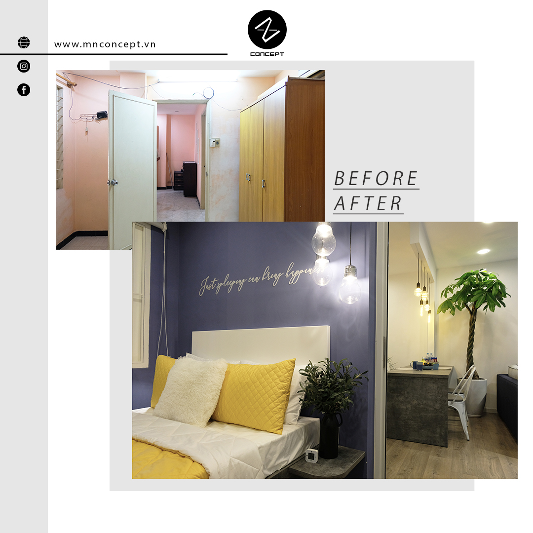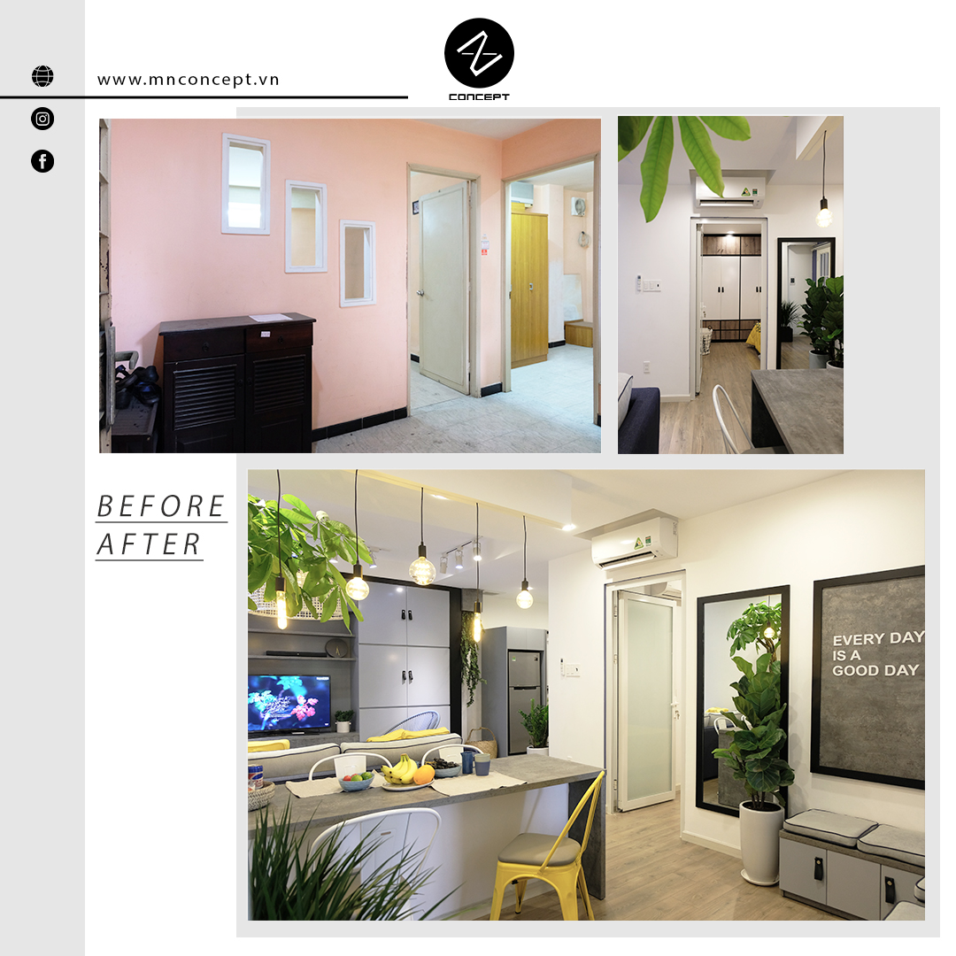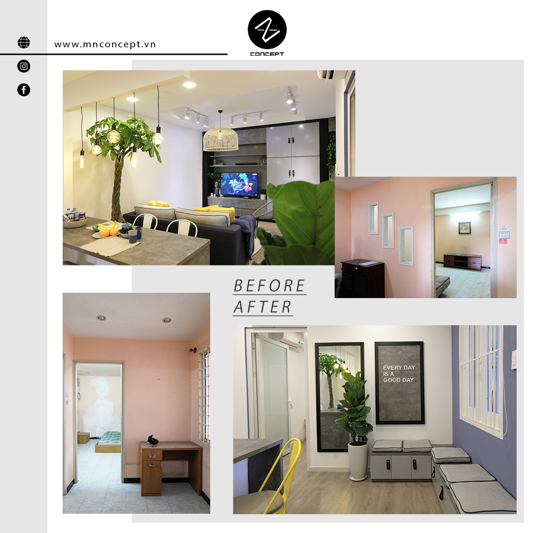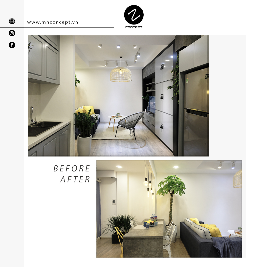 • Căn hộ có diện tích 45m2 nằm trong khu chung cư Nguyễn Kiệm của Sài Gòn. Sau một thời gian sử dụng căn hộ đã xuống cấp, các vách tường ngăn không gian và cách bố trí phòng làm căn hộ trở nên ngột ngạt và tù túng. Chính vì vậy mà MN CONCEPT đã nghiên cứu và thực hiện giải phóng không gian. Để rồi căn hộ, từng là không gian xuống cấp cũ kỹ nay đã trở mình mạnh mẽ với vẻ hiện đại cá tính.