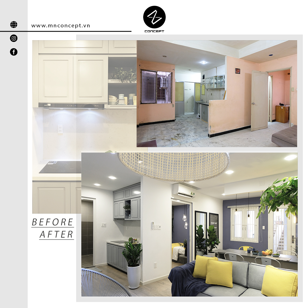 Việc đầu tiên MN CONCEPT tiến hành khi cải tạo là buộc quan tâm đến khối lượng công việc cũng như gam màu yêu thích của gia chủ để có những tính toán hợp lý. Hiện trạng ban đầu của căn hộ xuống cấp trầm trọng. Sau khi nắm bắt những việc cần làm, nhà thiết kế bắt đầu giải phóng không gian bằng cách phá dỡ các vách ngăn không cần thiết, hoặc xây thêm tường để các phần chưa bố trí chưa hợp lý sẽ thuận mắt và lưu thông thuận tiện hơn cho gia chủ.
